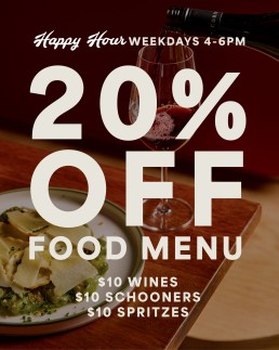 Enjoy 20% OFF FOOD MENU!$10 Wines, $10 Schooners, $10 Spritzes