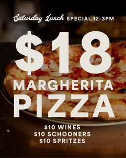 Join us every Saturday from 12–3pm for $18 Margherita pizzas and $10 wines, schooners & spritzes. Laid-back afternoons done right.