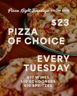 Every Tuesday from 6pm dive into any pizza for $23* with $10 wines, schooners & spritzes to match. The perfect excuse to skip the cooking.