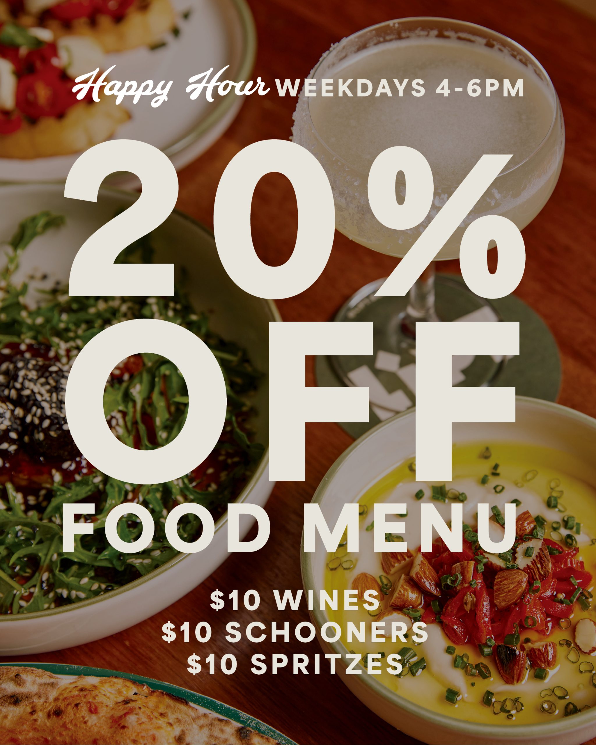 Enjoy 20% OFF FOOD MENU!$10 Wines, $10 Schooners, $10 Spritzes